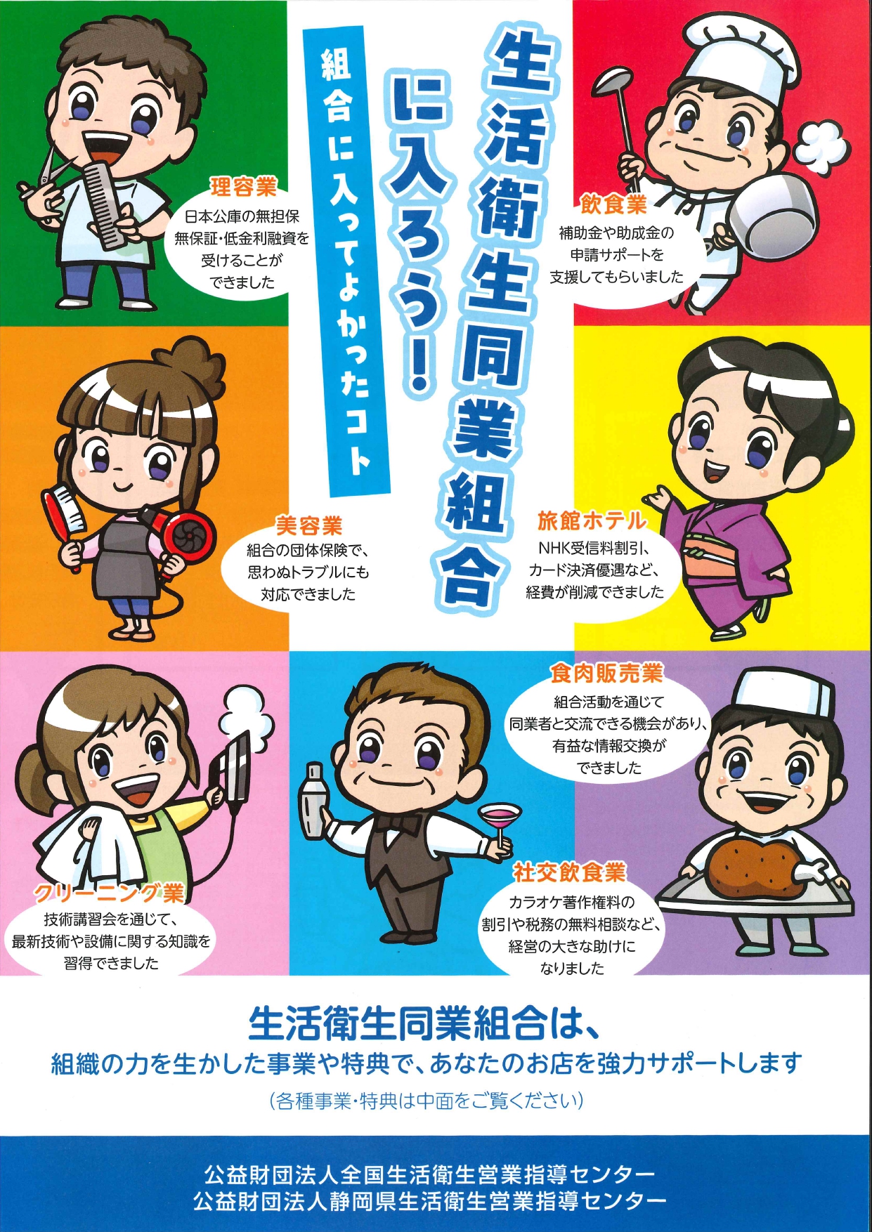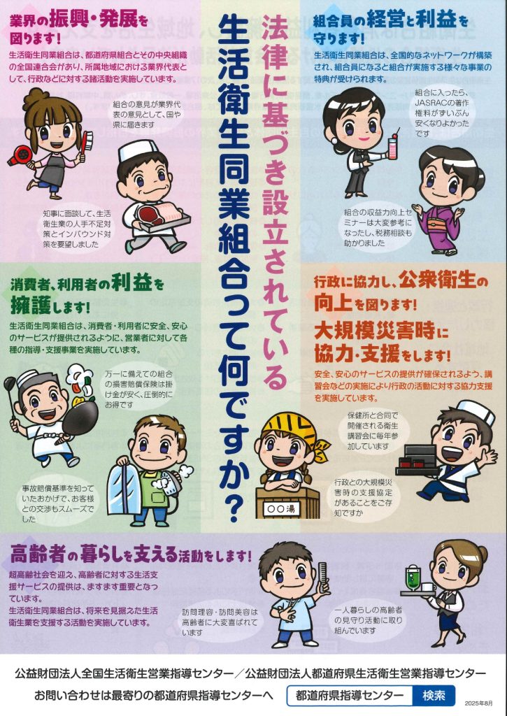 生活衛生同業組合は「生活衛生関係営業の運営の適正化及び振興に関する法律」に基づく営業者の自主的な活動団体です。