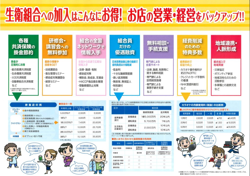 組合に加入すると、株式会社日本政策金融公庫の「生活衛生融資」が有利な条件で利用できます。
