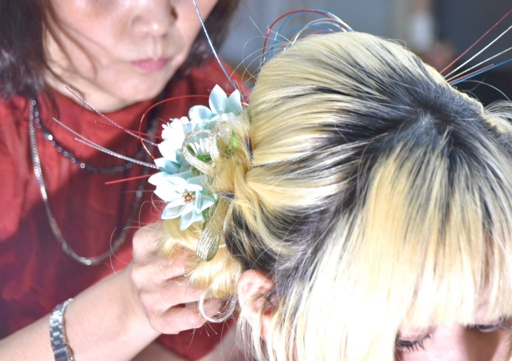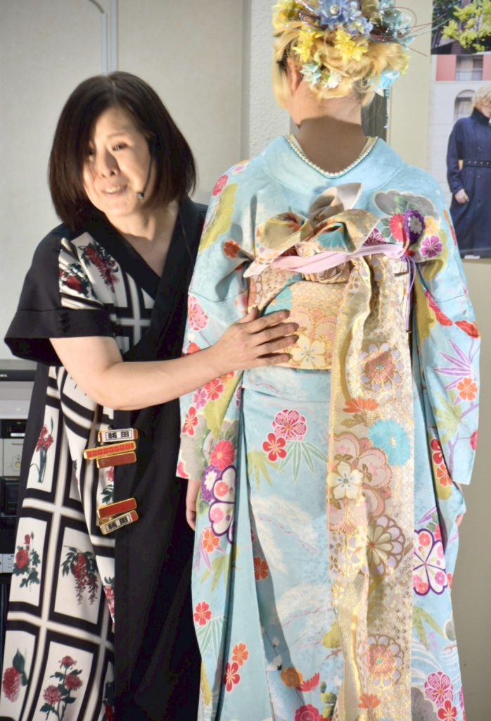 帯結びは、我々静岡県より全日本美容講師会着付け師範の”武田歩先生”、”水野奈穂美先生”をお招きし、「櫻花(さくらばな)」「フュージョン(融合)」の2点を実演、解説、披露していただきました。